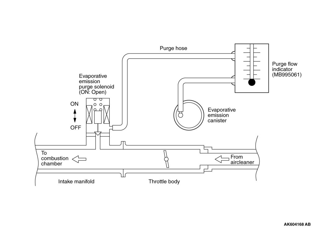 1. Disconnect the purge hose from the evaporative emission (EVAP) purge solenoid, and connect special tool MB995061 between the EVAP purge solenoid and the purge hose.