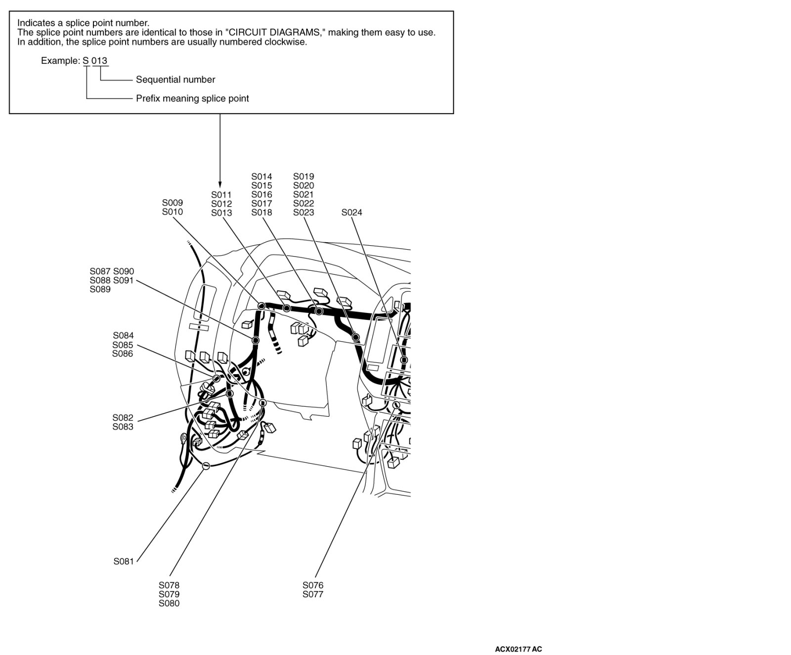 HOW TO READ SPLICE LOCATIONS"Splice locations" describes splice points of each wiring harness on an actual vehicle. Some variations are included in one splice location. Accordingly, some locations may not be applicable for individual vehicles.