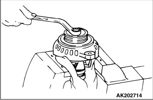4. Hold the pulley with the closed wrench. Rotate the rotor shaft clockwise to remove the pulley.