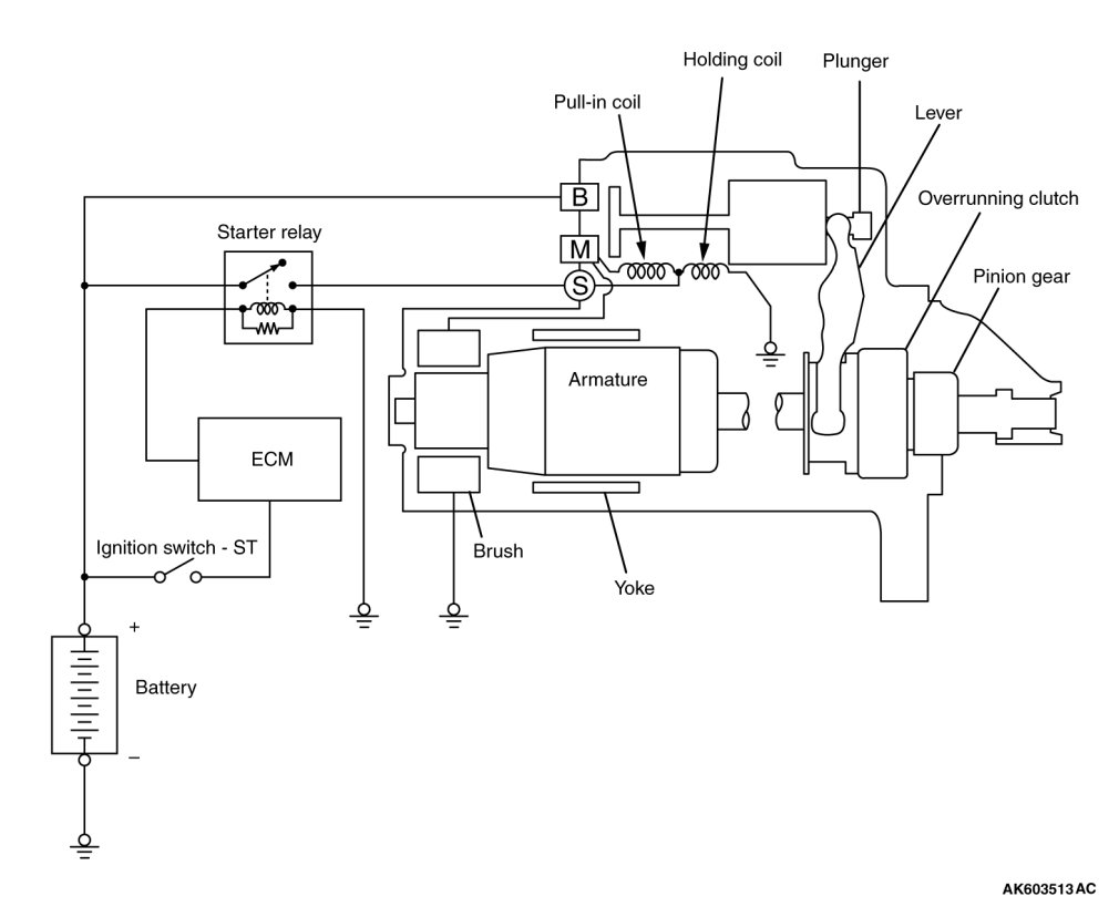 If the ignition switch is turned to the "START" position, current flows in the coil provided inside magnetic switch, attracting the plunger. When the plunger is attracted, the lever connected to the plunger is actuated to engage the starter clutch.