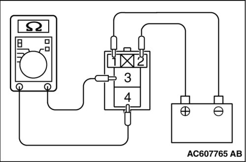 3. Check for continuity between A/T control relay terminals No.3 and No.4 when the jumper wires are connected to and disconnected from the battery.
