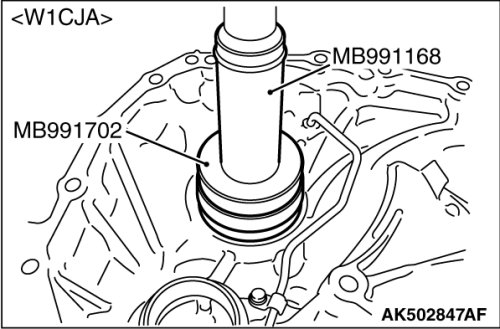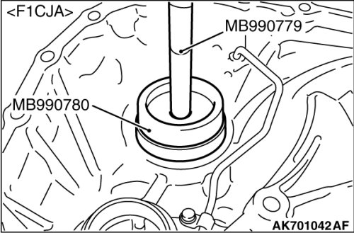 21. Using the special tools MB990779 and MB990780 [F1CJA] or MB991168 and MB991702 [W1CJA], Install the differential bearing outer race of differential side bearing on the converter housing.