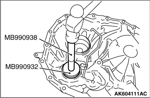 24. Using the special tool MB990780, install the outer race of differential side bearing on the transaxle case.