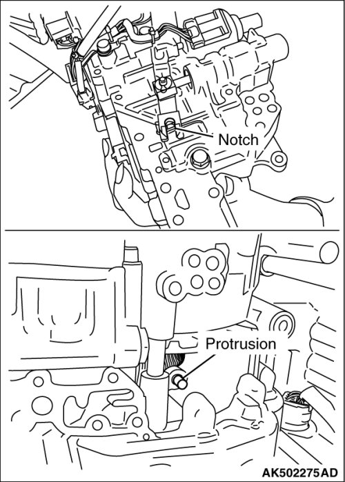 (2) Install the terminal body on the transaxle case, while aligning the detent of terminal body with the transaxle case as shown in the diagram.