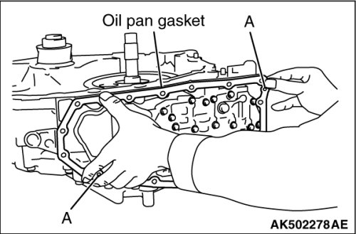 - When installing the oil pan gasket, align the dowel pins of transaxle case with dowel pin holes A of the oil pan gasket.