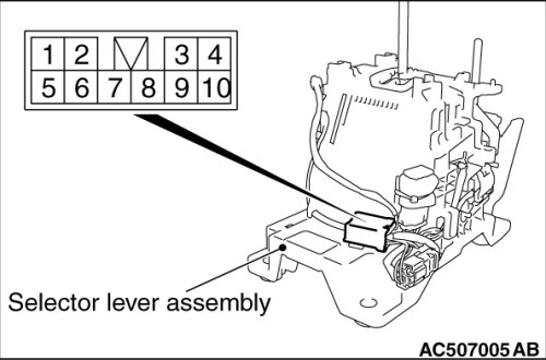 1. Measure the resistance between terminal No.3 and No.7 of the selector lever assembly connector.