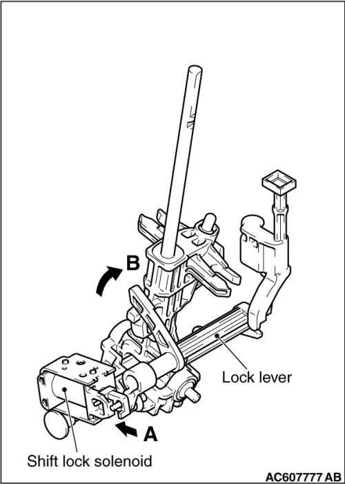 Check that the lock lever smoothly moves in the direction of arrow B in the figure when the shift lock solenoid plunger is pressed in the direction of arrow A, and smoothly moves back to the original position when the plunger is released.