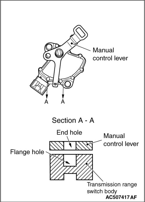 4. Align the hole at the end of the manual control lever and the hole in the transmission range switch body flange (section A - A).