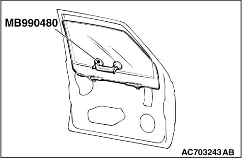 If tinting film is adhered to the door window glass, attach special tool MB990480 to the outside of the glass to prevent the film from peeling off.