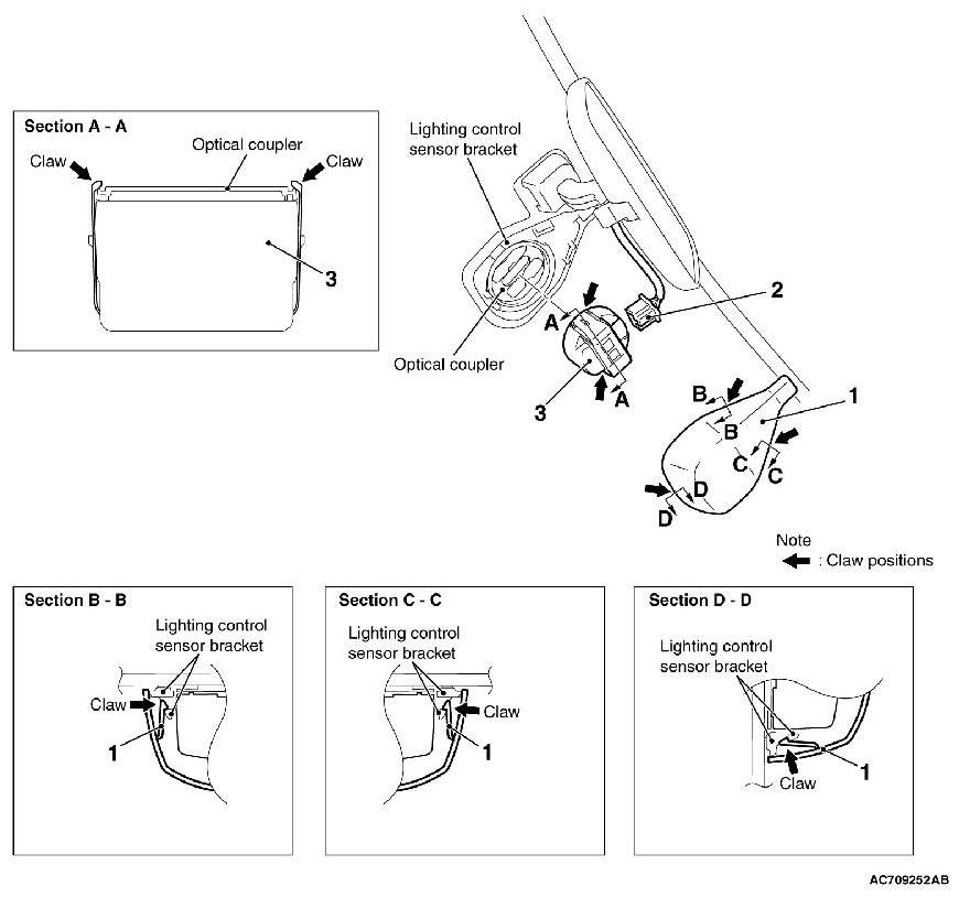 While pushing the clamp to the windshield side, pry up the clamp to disengage the right and left claws using the screwdriver (-), and then remove the lighting control sensor.