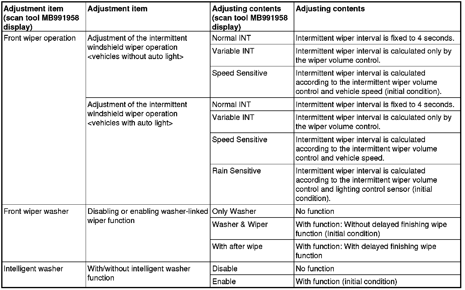 Using the ETACS system of scan tool MB991958, the following functions can be programmed. The programmed information is held even when the battery is disconnected.