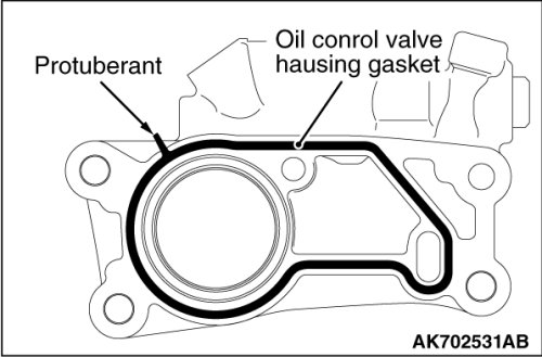 1. Install the engine oil control valve housing gasket and oil seal case gasket so that the protuberant is positioned as shown in the illustration.
