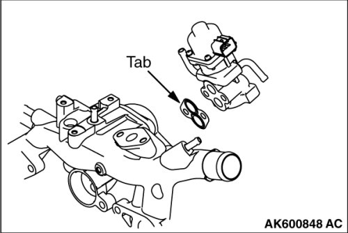Install the thermostat housing gasket so that the tab is positioned as shown in the illustration.