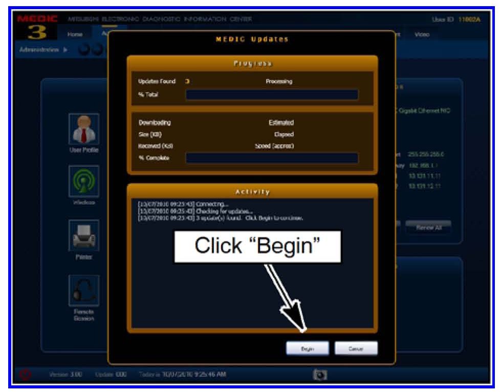 4. If the MEDIC update screen advises updates are available, click the "Begin" button. After all updates are complete, GO TO THE REPROGRAMMING PROCEDURE.