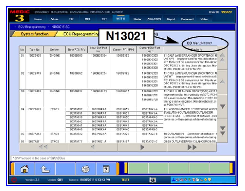 2. If the database number displayed on your MUT-III is lower than N13021, locate the Yellow MUT-III Reflash CD 01/13 and follow the instructions on the CD label to update your MUT-III.