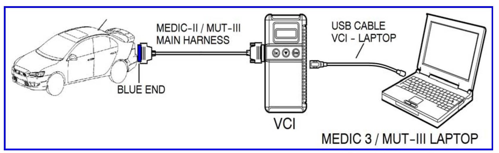 ^ Connect the MUT-III main harness (blue DLC connector) to the VCI.