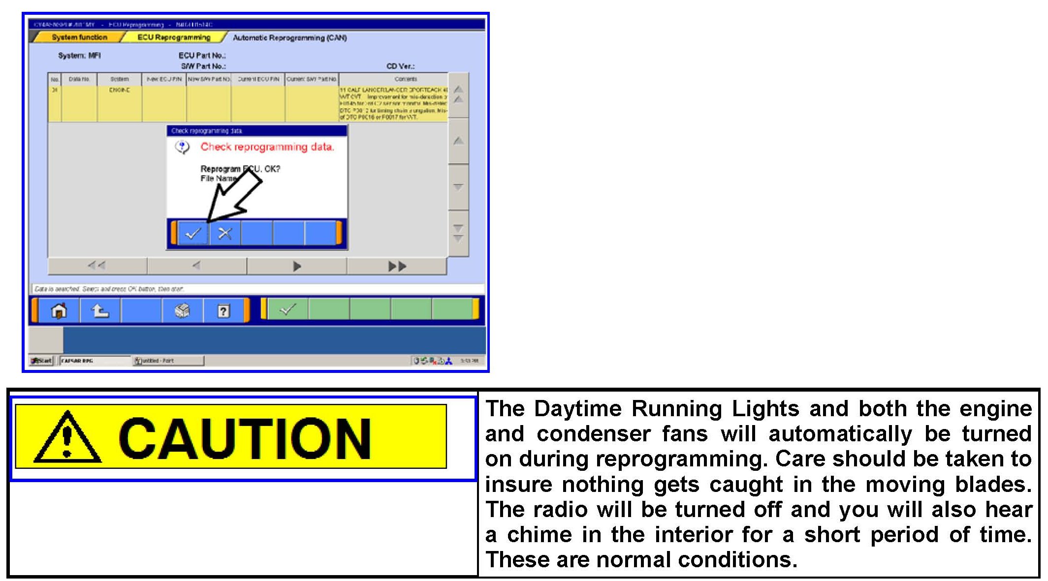 DO NOT DISTURB THE HARNESS CABLES OR CONNECTIONS. INTERRUPTION DURING THE REPROGRAMMING PROCESS COULD CAUSE THE CONTROL UNIT TO LOSE DATA OR PREVENT FUTURE REPROGRAMMING. IF THE USB CABLE IS DISCONNECTED DURING THIS PROCEDURE, A WARNING MESSAGE WILL DISPLAY ECM Reprogramming