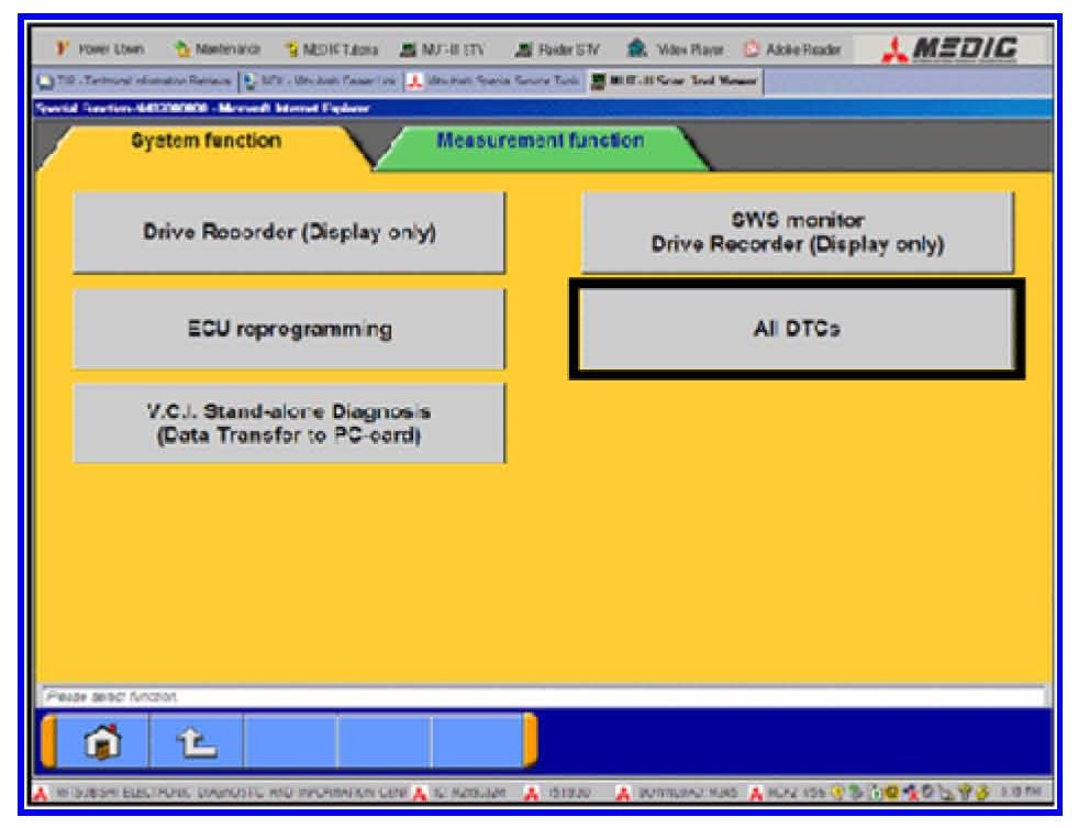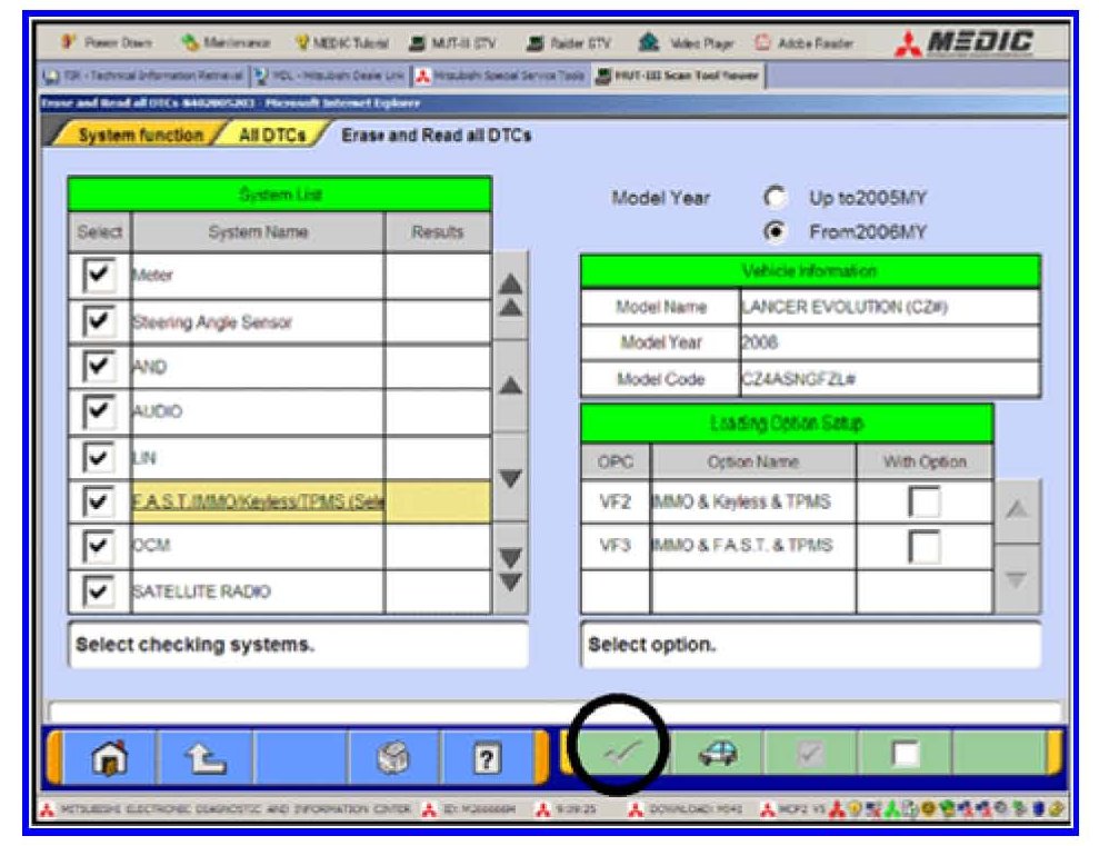 3. Using the MUT-III, check and erase ALL DTCs from all systems as follows.