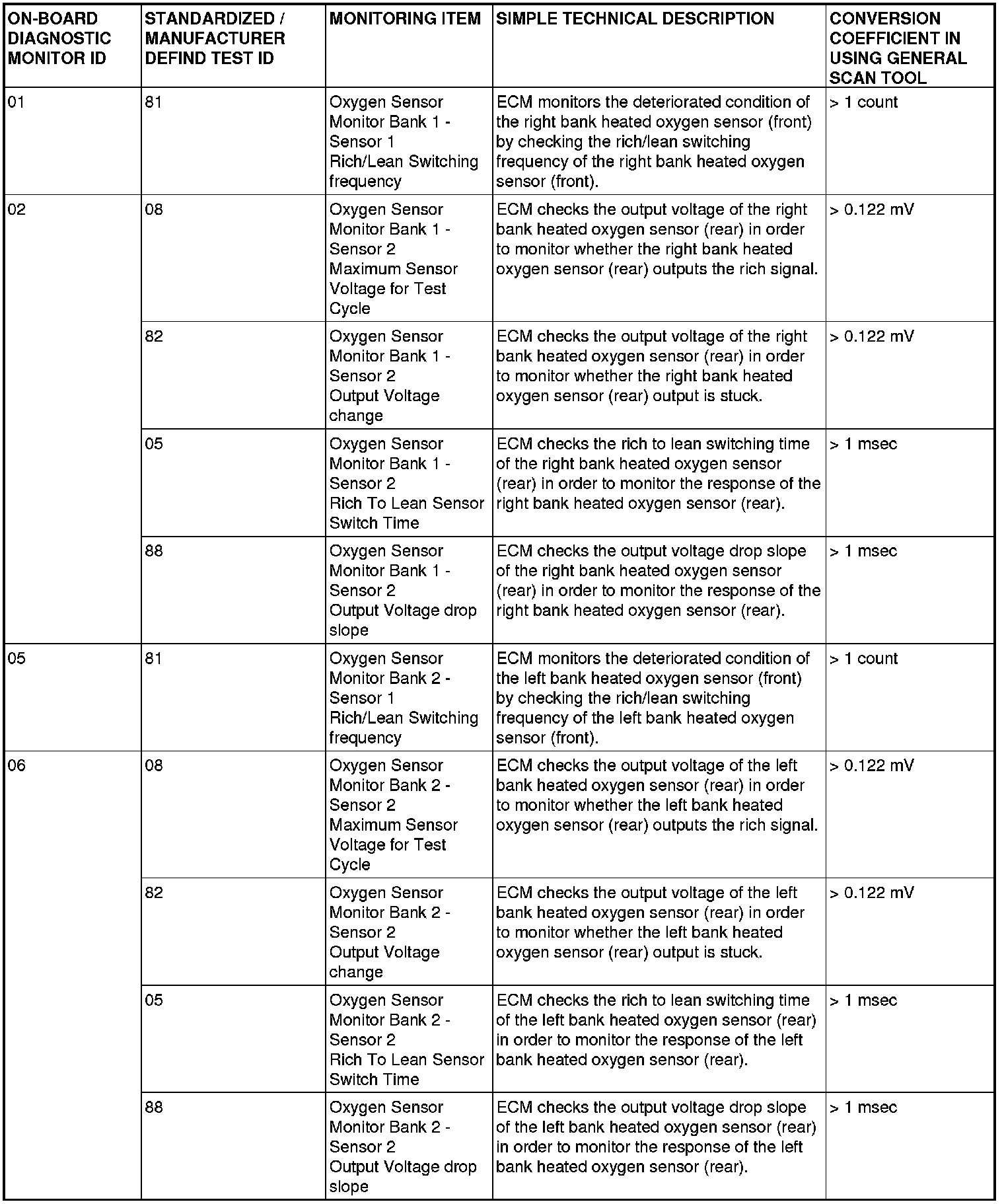 By selecting MODE 6 using scan tool, Test Result and Limit Value (minimum) *1 or (maximum) *2 about the main items of emission control system which ECM monitors can be confirmed. The value at the last monitoring is output by ECM as a test result.