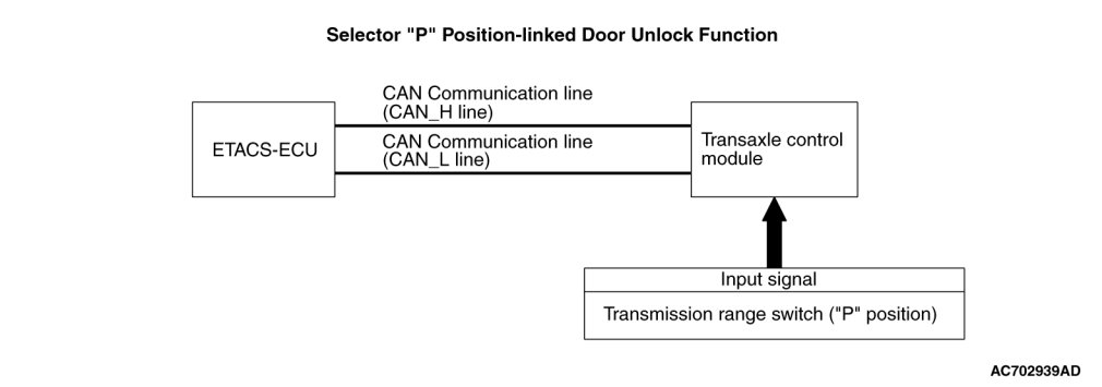 If the doors are not unlocked when the selector lever is shifted to the "P" position, a malfunction of the shift position signal input circuit(s) or ETACS-ECU is suspected. Also, the selector "P" position-linked door unlock function may have been set to "Disabled" with the customization function.
