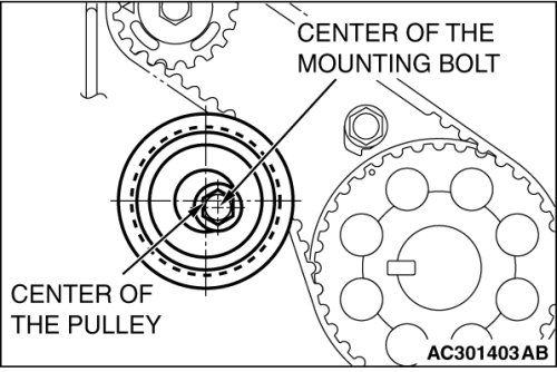 When tightening the mounting bolt, ensure that the timing belt tensioner pulley does not rotate with the bolt. Allowing it to rotate with the bolt can cause deficient tension of the belt.