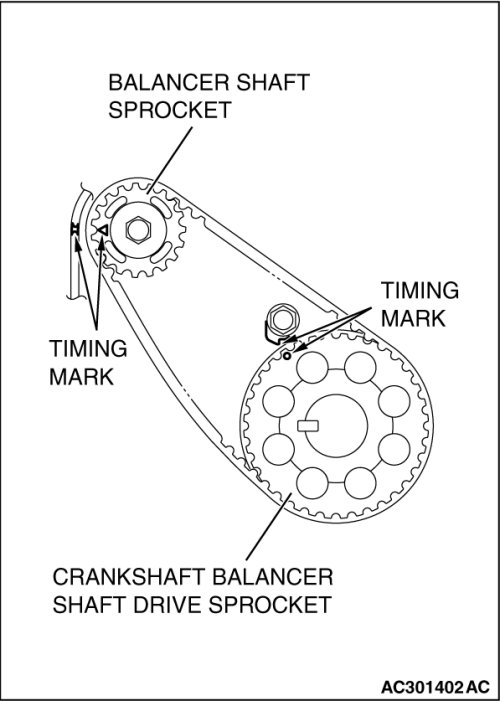 1. Ensure that the crankshaft balancer shaft drive sprocket timing marks and balancer shaft sprocket timing marks are aligned.