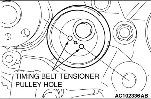 When replacing the timing belt tensioner adjuster with new parts, the timing belt tensioner adjuster is set with a pin.