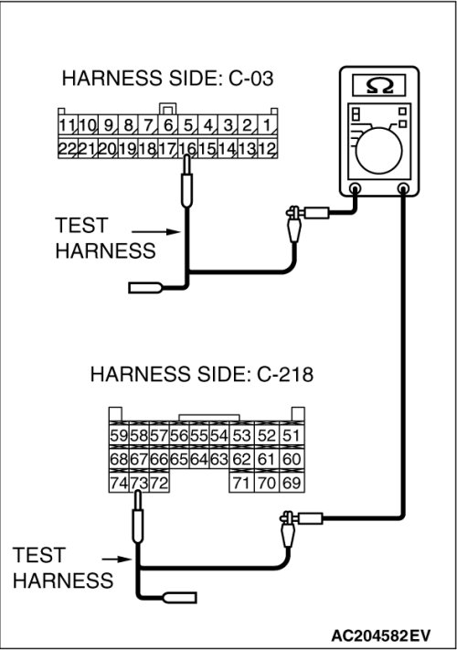 (1)Disconnect joint connector (3) C-03 and ETACS-ECU connector C-218, and measure the resistances at the wiring harness sides of joint connector (3) C-03 and ETACS-ECU connector C-218.