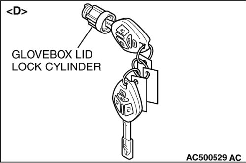 - When replacing the components by the door lock key cylinder of illustration[ C] or the glove box lid lock cylinder of illustration[ D], do not register the encrypted code with the bar code on the ignition key which is supplied to each lock cylinder simultaneously.