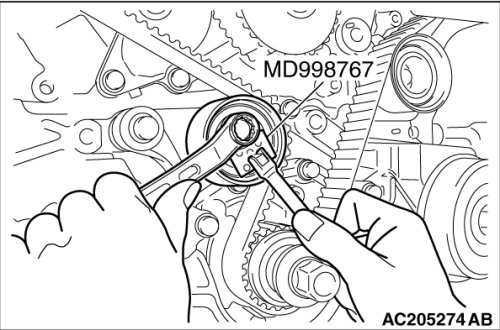 4. Use special tool MD998767 to push the tensioner pulley into the timing belt, then temporarily tighten the center bolt.