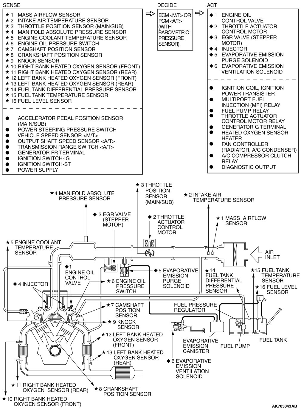 The Multiport Fuel Injection System consists of sensors which detect the engine conditions, the ENGINE CONTROL MODULE (ECM) [M/T] POWERTRAIN CONTROL MODULE (PCM) [A/T] which controls the system based on signals from these sensors, and actuators which operate under the control of the ECM [M/T] or the PCM [A/T].