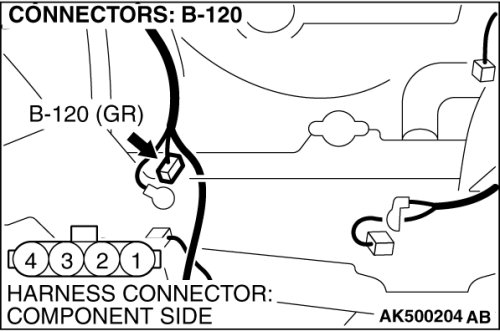 STEP 2. Check harness connector B-22 at ECM [M/T] or PCM [A/T] connector and harness connector B-120 at generator connector for damage.