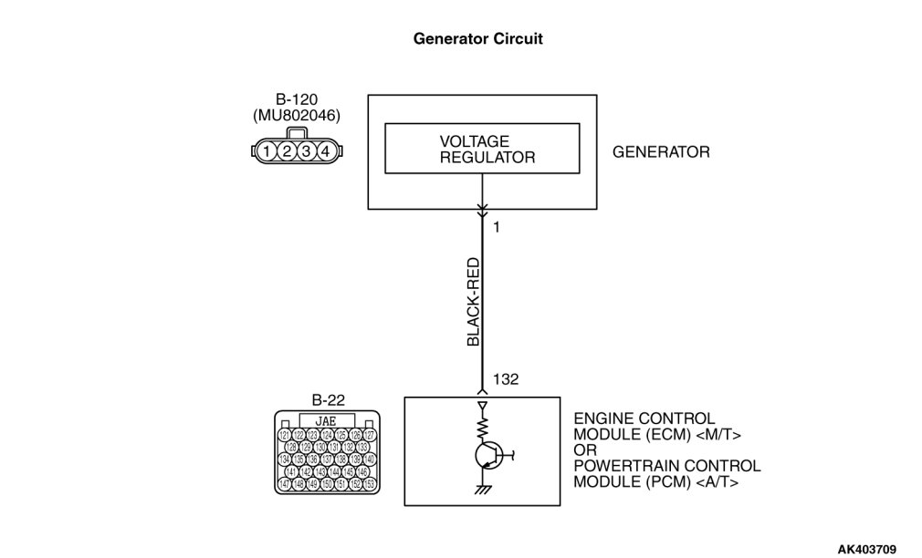 STEP 3. Check for open circuit and short circuit to ground and harness damage between generator connector B-120 (terminal No. 1) and ECM [M/T] or PCM [A/T] connector B-22 (terminal No. 132).