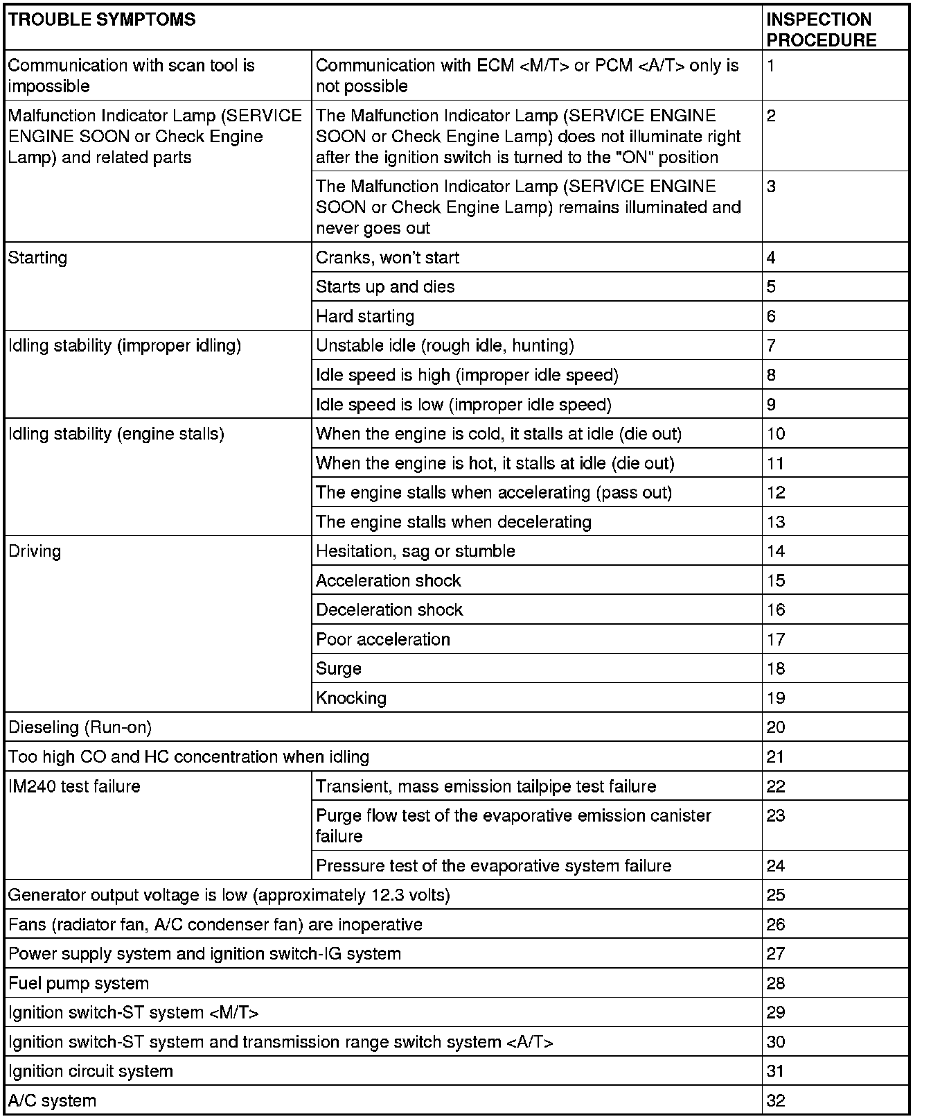 Check that the ECM [M/T] or the PCM [A/T] ground circuit is normal before checking for the cause of the problem.
