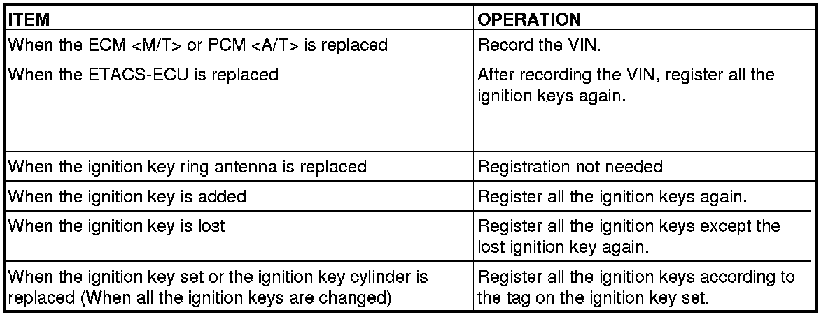 The ignition key contains a transponder (small transmitter), which retains an unique encrypted code. When replacing the parts of the immobilizer system, always register the encrypted code or VIN, or both of them according to the list below. The ETACS-ECU can retain a maximum of eight different encrypted codes. This means that a maximum of eight ignition keys can be registered.