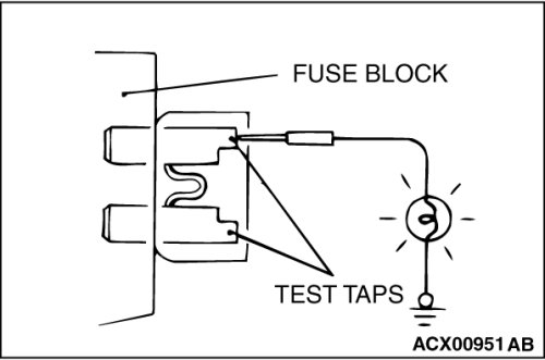 A blade type fuse has test taps provided to allow checking of the fuse itself without removing it from the fuse block. The fuse is okay if the test light comes on when its one lead is connected to the test taps (one at a time) and the other lead is grounded. Remember to turn the ignition switch to ON to ensure all circuits are live.