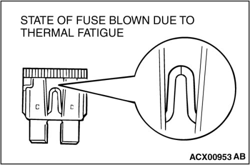 The illustration shows the state of a fuse blown due to repeated current on/off.