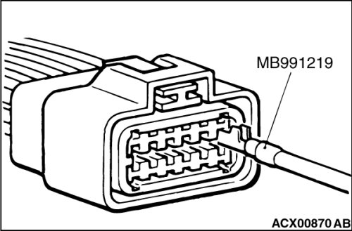 Use special tool MB991219 to inspect the engagement of the male pins and female pins. [Pin drawing force: 1 N (0.2 pound) or more]