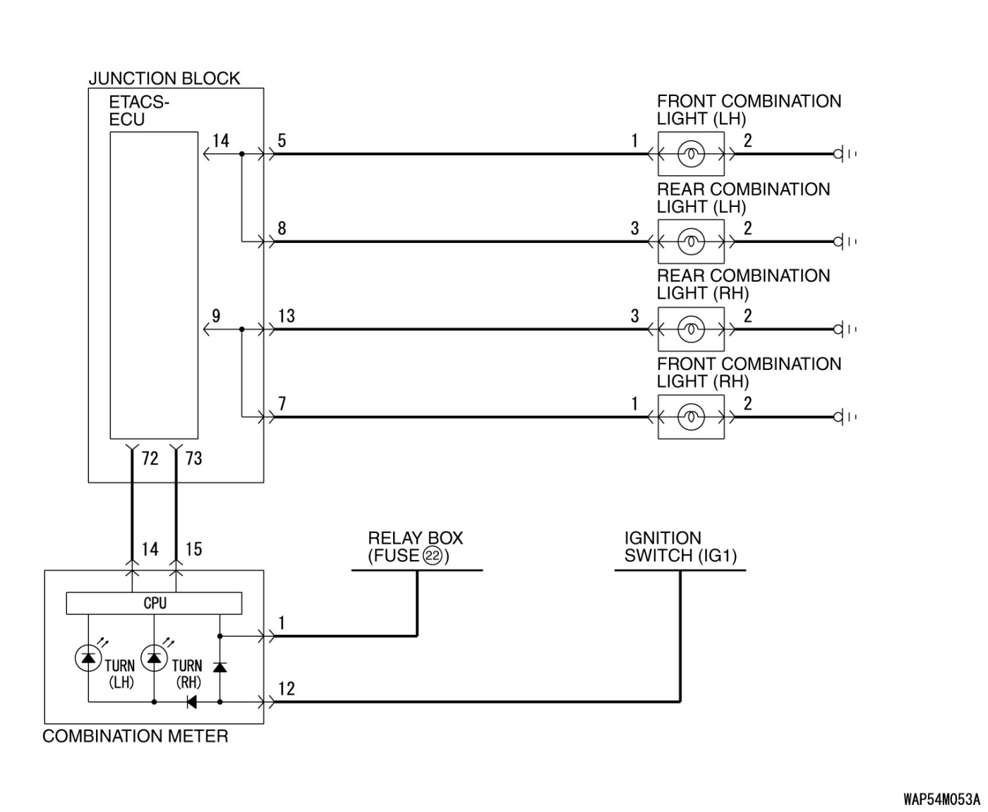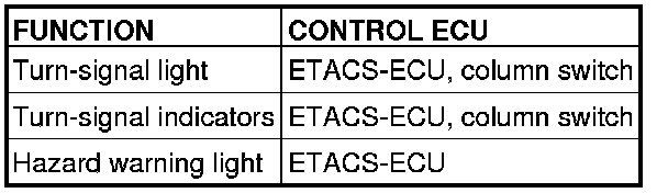 At the same time that the turn-signal lights are illuminated, the ETACS-ECU sends a signal to illuminate the turn-signal light indicator via the CAN bus line. The combination meter receives the transmitted signal and turns the turn-signal light indicator on and off.