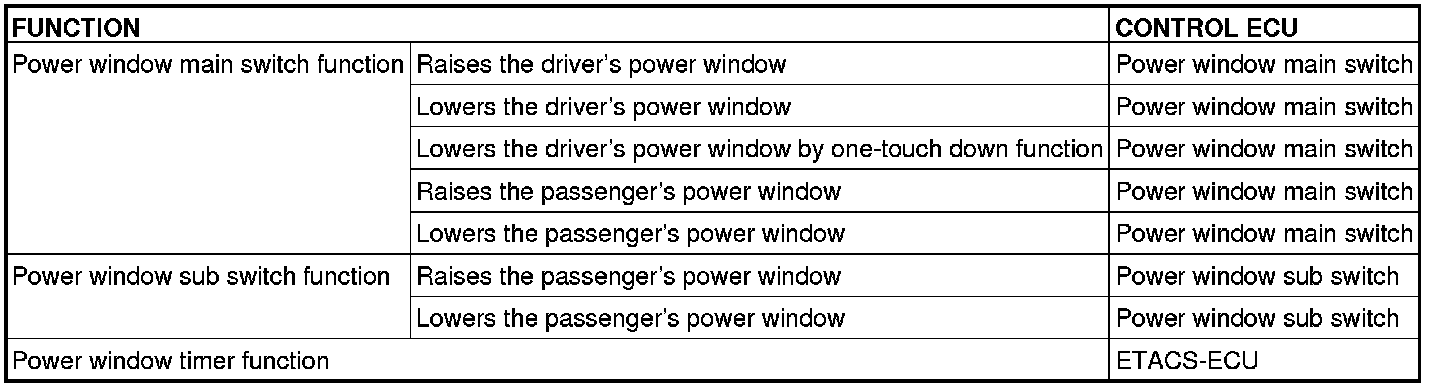 Even after the ignition is switched off, the ETACS-ECU keeps the power window relay activated for approximately 30 seconds, enabling raising and lowering of the power windows by using the power window switches. After approximately 30 seconds, the power window relay is deactivated.