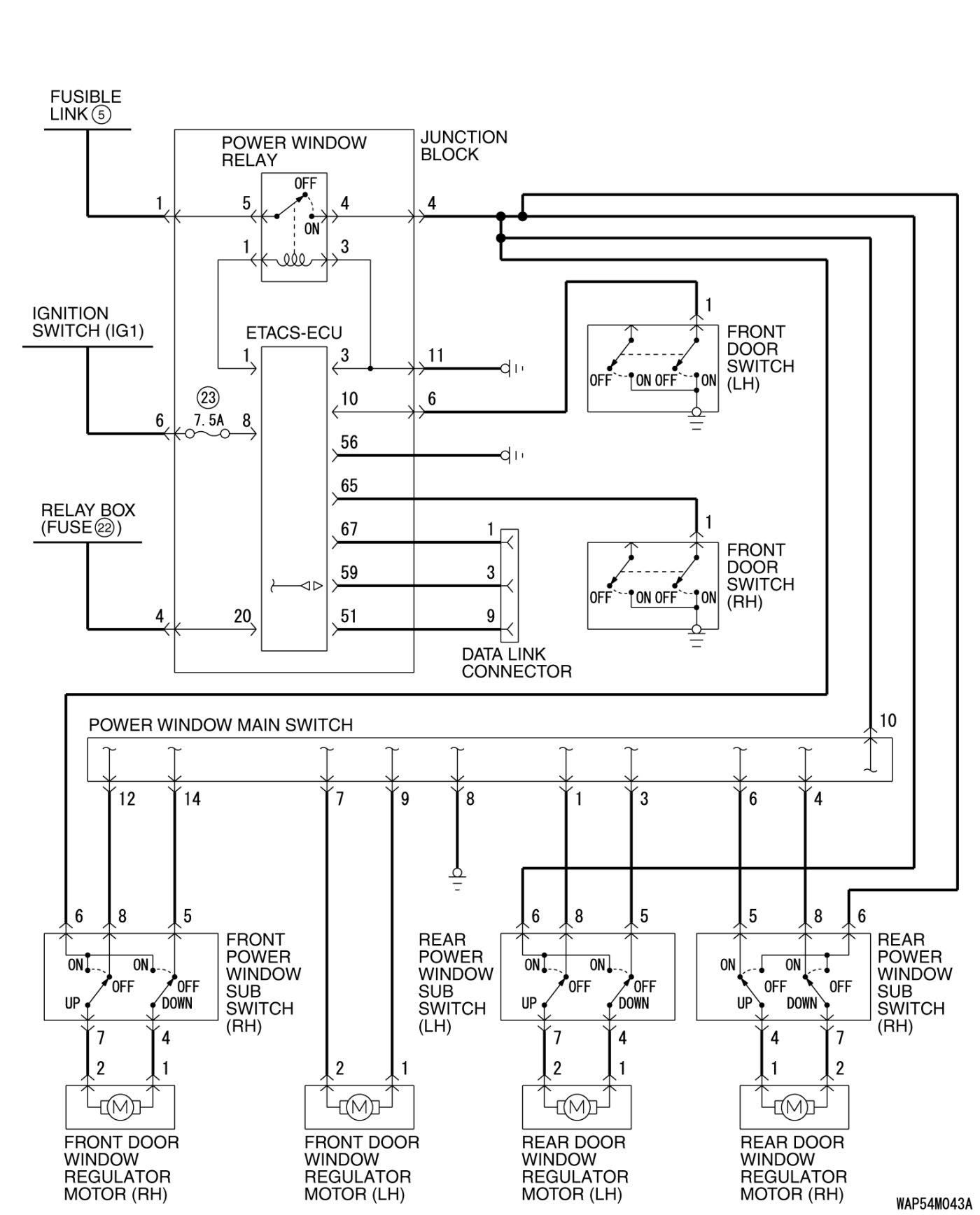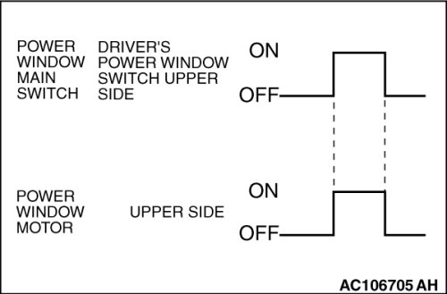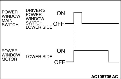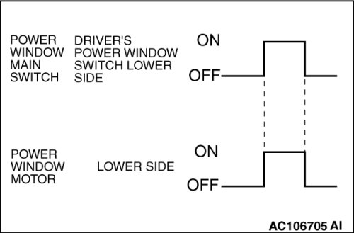 When the driver's power window switch on the power window main switch is pushed down fully, the system energizes its respective power window motor, and then the driver's window glass moves to its lowest position.