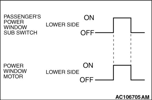 When the passenger's power window switch on the power window main switch is pushed down, the system energizes its respective power window motor, and then the passenger's window glass lowers.