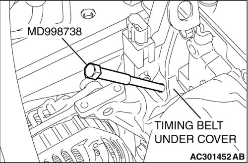 Special tool MD998738 can be gradually installed at a rate of a 30 degree turn per second. If it is screwed in all at once, the timing belt tensioner adjuster rod will not easily retract and special tool MD998738 may bend.
