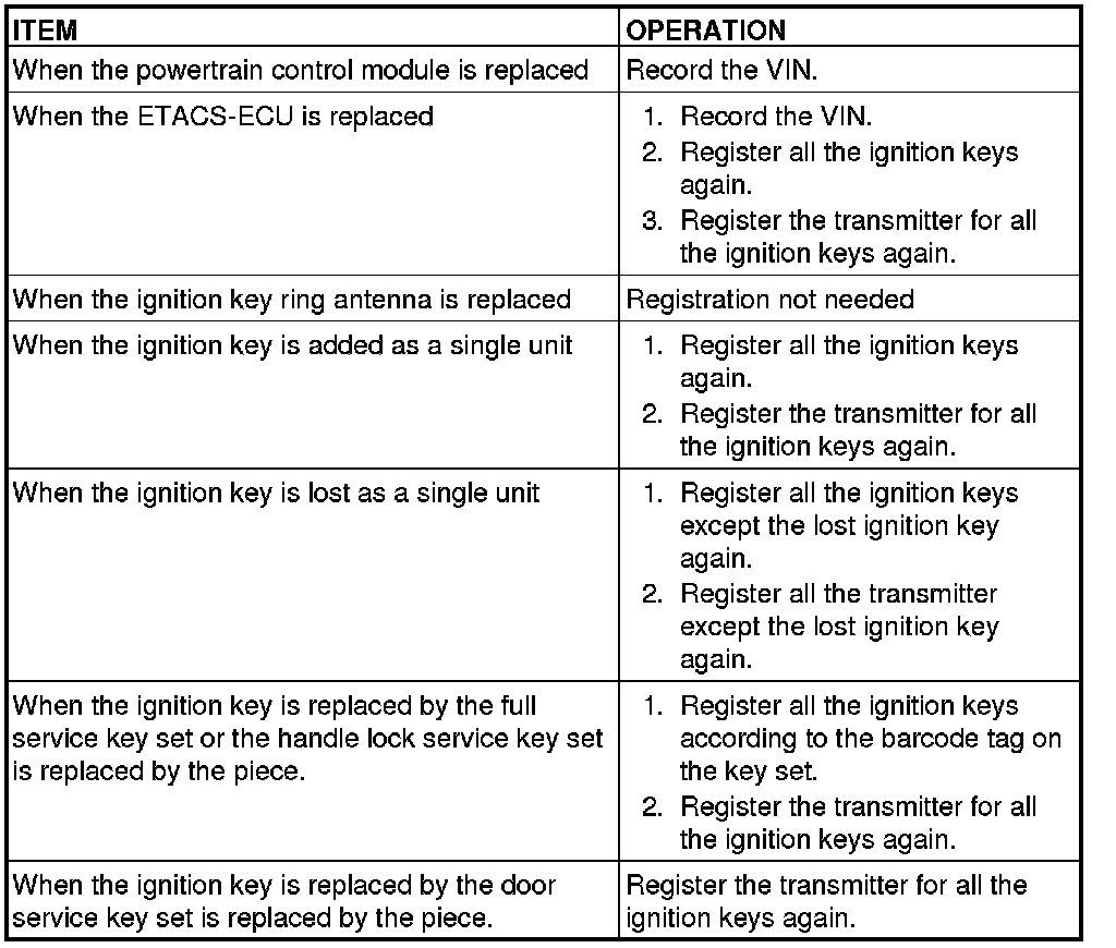 The ignition key contains a transponder (small transmitter), which retains an unique encrypted code. When replacing the parts of the immobilizer system, always register the encrypted code or VIN, or both of them according to the list below. The ETACS-ECU can retain a maximum of eight different encrypted codes. This means that a maximum of eight ignition keys can be registered.