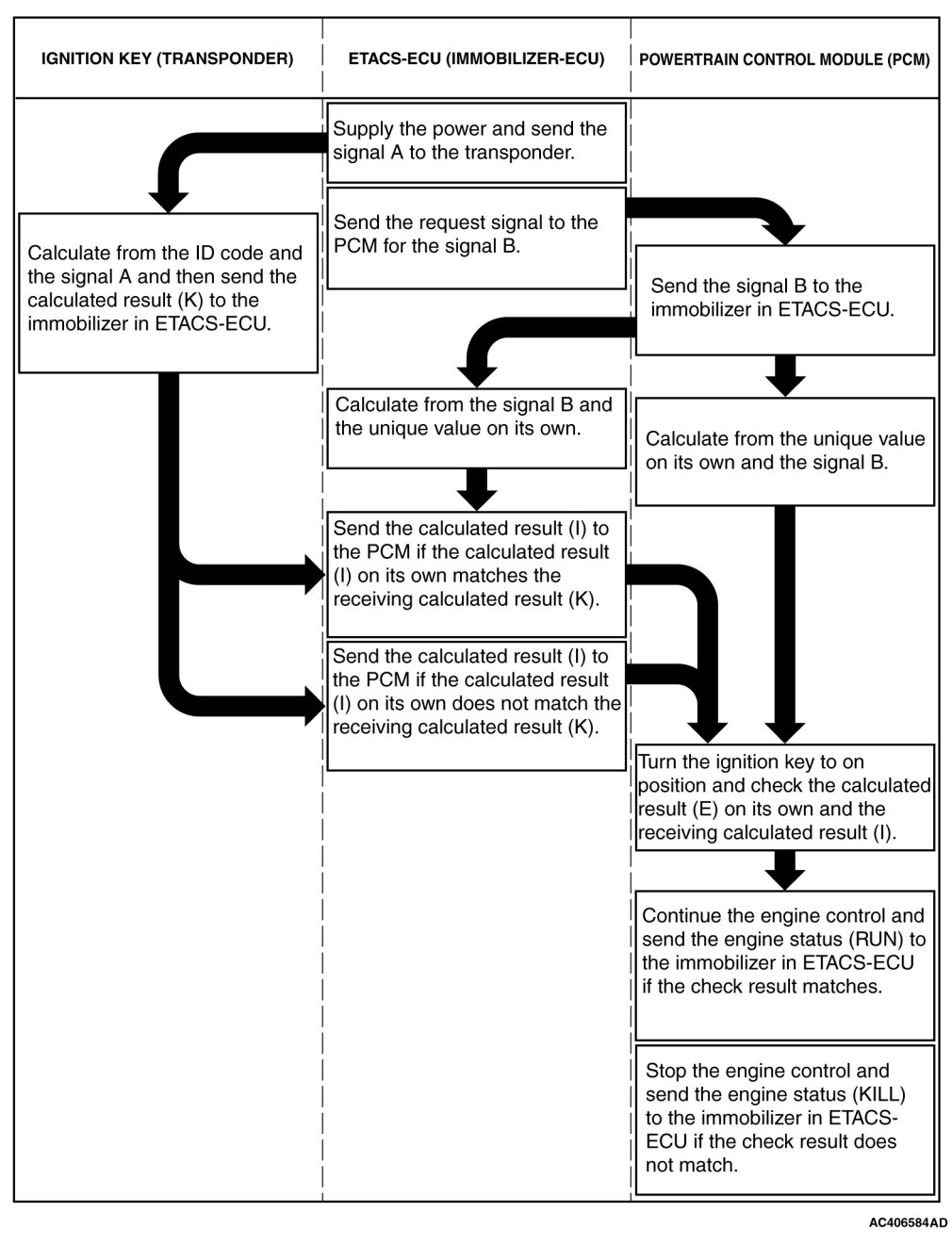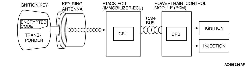The engine immobilizer system prevents the engine from starting and immobilizes the vehicle if a key other than the key registered for that vehicle is used in an attempt to start the engine after forced entry. The engine immobilizer system consists of the ignition key, the key ring antenna, the ETACS-ECU (immobilizer-ECU), and the powertrain control module (PCM). It has these functions: