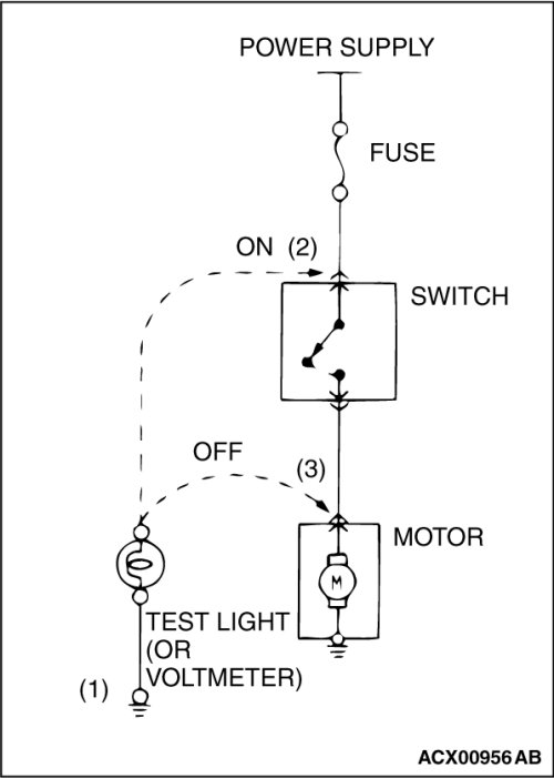 (3) Then, connect the test light or voltmeter to the motor connector. The test light should not come on, or the voltmeter should indicate no voltage. When the switch is turned ON in this state, the test light should come on, or the voltmeter should indicate a voltage, with the motor starting to run.