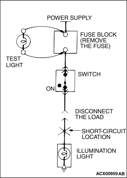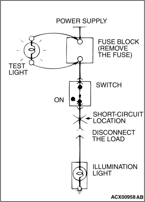 STEP 1. Remove the blown fuse and connect the test light across the fuse terminals (Circuit switch: OFF).