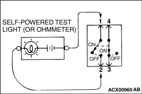 (2) When the switch is the "ON" position and the contact points of terminals 3 and 4 are connected, the self-powered test light should come on or the ohmmeter should read 0 ohm.