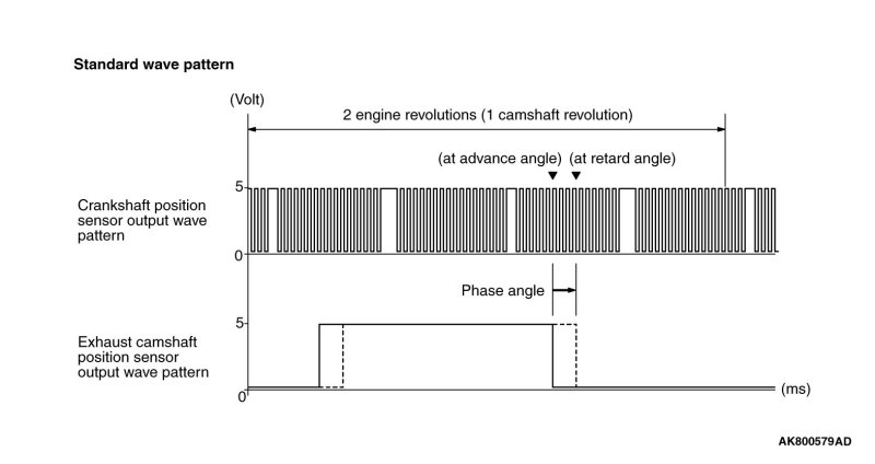- Verify that the relative position of the exhaust camshaft position sensor's output wave changes when the low load operation changes to the high load operation.