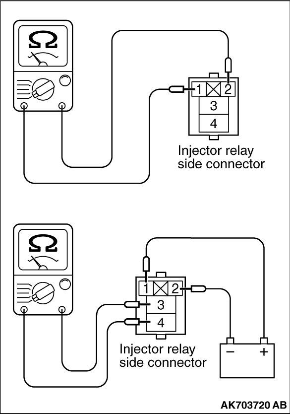 Inspect the injector relay for continuity in accordance with the chart shown below.
